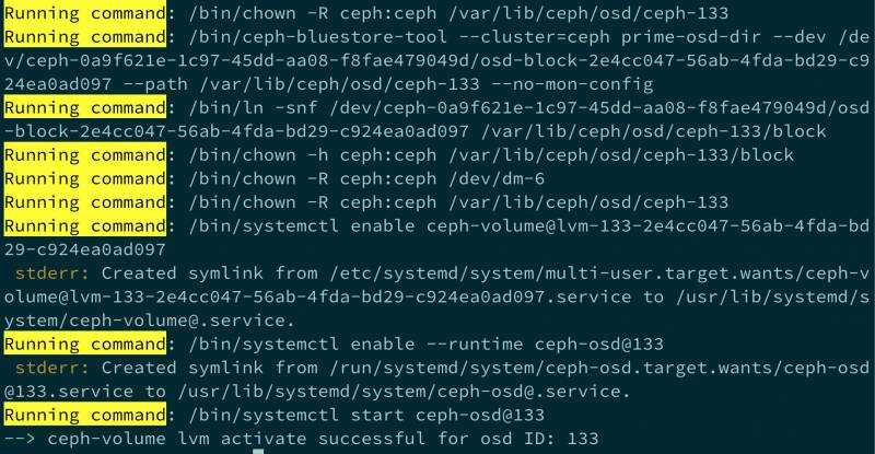 ceph-volume lvm zap /dev/sdg ceph-volume lvm prepare --bluestore --data /dev/sdg ceph-volume lvm activate --bluestore 133 2e4cc047-56ab-4fda-bd29-c924ea0ad097
